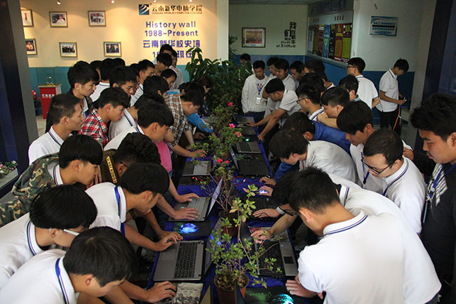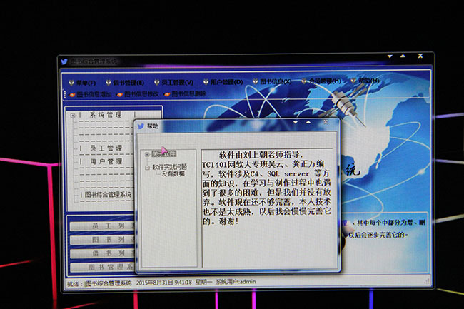 据学院网软教研室学科带头人刘上朝主管介绍,此次所参展的作品作品采用Microsoft.NET FrameWork 4.0平台开发设计,开发语言为目前比较流行的C#语言、Java语言和PHP.开发了CRM,图书管理系统,存管理系统,烟叶收购系统等。后台数据库为SqlServer2008和mysql,作品为两层架构,采用比较流行的C/S(客户端/服务器)和B/S(浏览器/服务器),在企业内部网络和互联网中实现。