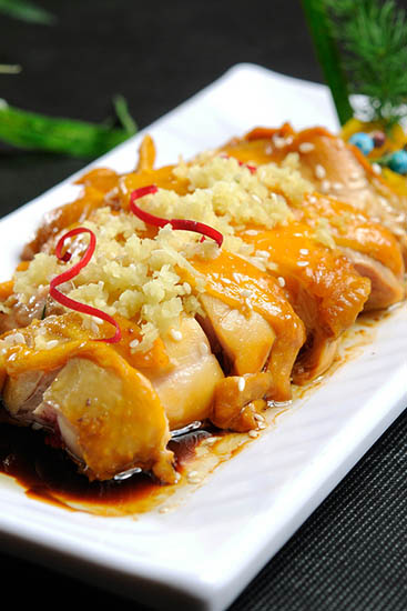 1、嫩鸡去头,颈、翅、脚爪、洗净后入沸汤锅中加姜、葱、料酒煮熟; #