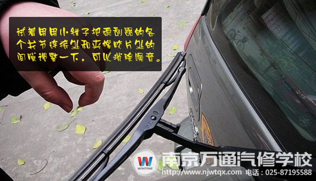 有时会雨刮片启动时发出“呱呱”的噪音,其实并非是雨刮器老化损坏该换了,如果用小工具检修、调整还可以继续用。试着用用小钳子把雨刮器的各个关节连接处和夹橡胶片处的间隙调整一下,可以消除噪音。