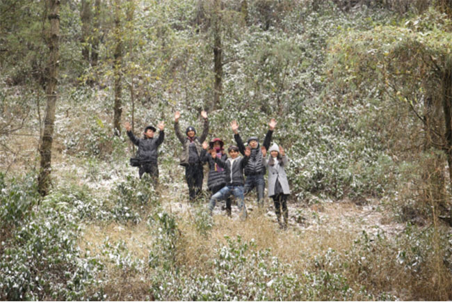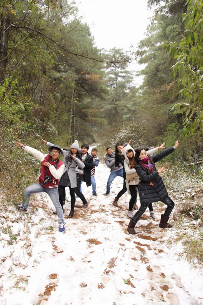 此时的雪越下越大,师生们的头上身上沾满了一层淡淡的雪,但是每个人的脸上都挂灿烂的笑脸。