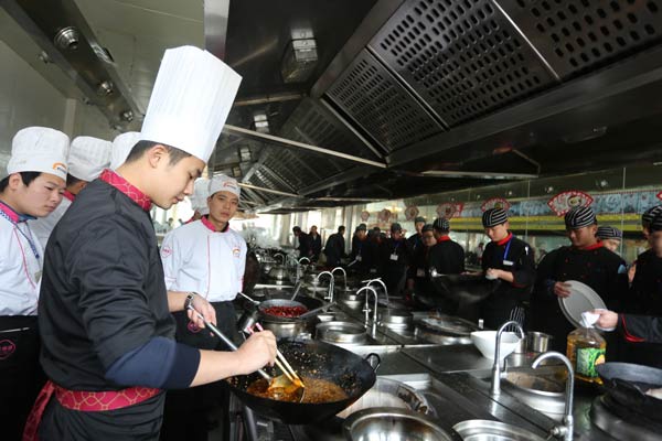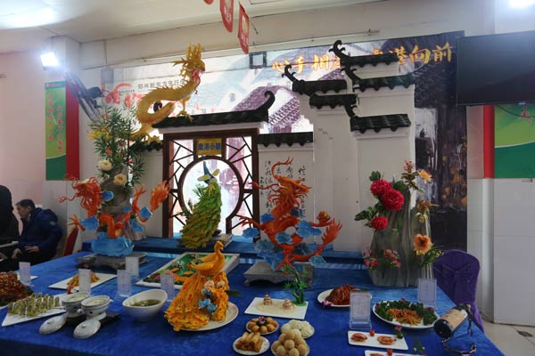 一大早,鹿港小镇校企定向班的宴席制作就拉开了序幕,他们的制作快速但又不乏精致,糖艺、面塑,整雕……所有的菜品给人的感觉就是两个字:大气。整个展台凝聚了鹿港小镇定向班学子们的心血。 #