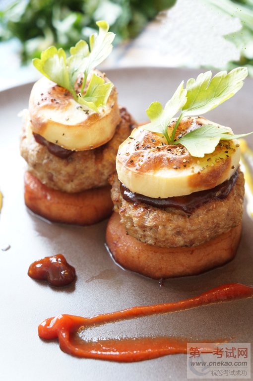 5、依次铺排上红酒梨—肉饼—烟熏烧烤酱—烤土豆片,装饰少许番茄酱、法式芥末酱、香菜即可。 #