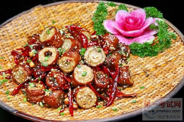 锅里去较多的油,烧至6成热,倒入肥肠段,肥肠段上色后迅速捞出备用,锅里去油烧热,倒入打湿了的辣椒和麻椒,将辣椒和麻椒烧干水分并炒香;