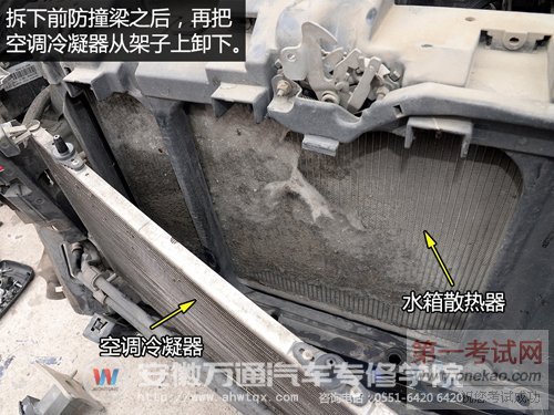 空调冷凝器和水箱都位于车头的位置。当车辆在行驶时,空气会顺着中央进气格栅进入这里,所以空气中夹带的飞絮、树叶等脏东西就会附着在空调冷凝器和水箱散热器上。