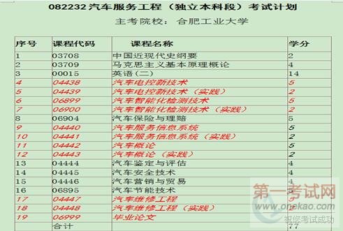 据安徽万通汽车专修学院学历服务中心程本武主任介绍,汽车服务工程专业自考本科主考院校为合肥工业大学,共13门考试计划,其中8门国考,5门校考,外加论文设计答辩。安徽万通汽车专修学院作为合肥工业大学高等教育自学考试学习服务中心,在校生享有中国近现代史纲要(课程代码03708)、马克思主义基本原理概论(课程代码03709)两门国考课程免考权利,学校还将在后期的校考中作为考点迎接各方考生。