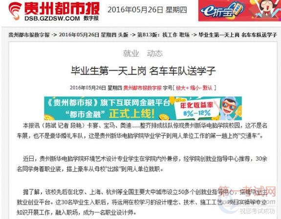 《贵州都市报》报道:学院毕业生第一天上岗,名车车队送学子(详见:2016年5月26日第B13版)