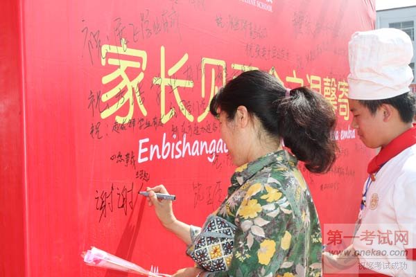 既定的时间为早上九点到九点半家长到校,有一些学生的家长早早来到了学校。到学校后的家长,到签到处签到,并领取了学校准备的精美礼品,然后到学校特意制作的寄语墙上签名,写下对自己孩子的祝福和期望。每一位家长站在寄语墙旁书写的时候,脸上都带着那难以掩饰的高兴以及对孩子们的殷切期望。