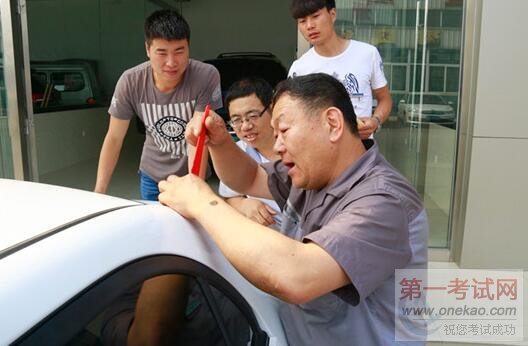 采访李延起老师的时候,正值中午,刚刚吃过午饭,山东万通汽车学院的教学楼里空空荡荡。可是在汽车美容教室里,学生们三个一群、五个一组,在李老师的指导下有序地练习汽车贴膜。