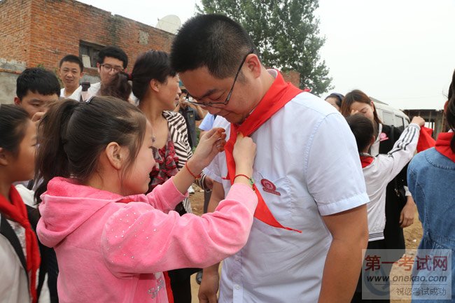 吕河小学同学为河南新华电脑学院爱心代表李国坤主任佩戴红领巾