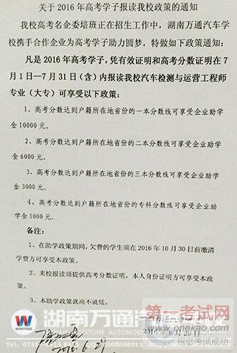 凡是2016年高考学子,凭有效证明和高考分数证明在7月1日—7月31日(含)内报读我校汽车检测与运营工程师专业(大专)可享受:高考分数达到户籍所在地省份的一本分数线可享受企业助学金10000元、二本分数线可享受企业助学金6000元、三本分数线可享受企业助学金3000元、高考分数达到户籍所在地省份的专科分数线可享受企业助学金1000元。 #