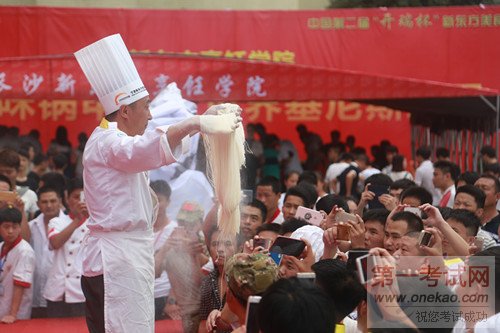 在第二届“开瑞杯”新东方美食狂欢节上,多位中国烹饪大师现场展示的烹饪“绝活”成为另一大亮点。独轮车头顶刀削面、关公扯面、蒙眼切菊花豆腐、板针气球切腰花等绝活轮番上演,高超的技能博得了现场观众的眼球与赞誉。向寒大师“蒙眼切菊花豆腐”,运用精湛的刀工将豆腐切成菊花盛开状,“豆腐丝”粗细均匀,置于汤汁中,温情绽放;张成国、马晓亮大师带来的“独轮车头顶刀削面”,一边脚蹬独轮车,一边双手同时削面,引得现场观众拍手叫绝;李海滨大师“长寿一根面”,寓意新东方烹饪教育长长久久。