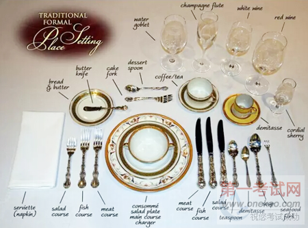 基本要领:左叉右刀,先里后外,刀口朝盘,各种餐具成线,餐具与菜肴配套。