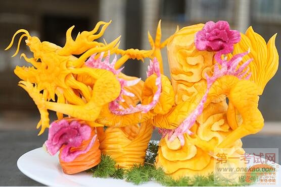 有位学生说:在平时的雕刻中,我们只有把手中的食物当作一个个生命去对待才能雕刻出富有灵气的作品。展台上的果蔬雕刻,就好比一件件巧手雕琢的艺术品。有傲视群雄展翅高飞的雄鹰,有停歇在树梢上报喜的喜鹊,还有盘旋的巨龙以及浴火重生的凤凰等。透过每一件果蔬艺术雕刻作品,仿佛看到了一幅幅生动的画面。画面里,学生们正手执雕刻刀,专心致志地修饰着自己的毕业作品。眼神中,流露的尽是一种严谨之态。