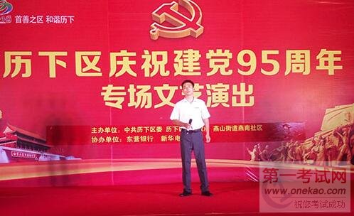 7月28日晚,山东新华电脑学院东校区歌声飞扬,舞姿翩翩,掌声如潮,历下区庆祝建党95周年专场文艺演出在这里精彩上演。此次晚会由中共历下区委、历下区人民政府、燕山接到燕南社区主办,山东新华与东营银行共同承办。历下区燕山街道办事处邵明英主任,历下区燕山街道办事处社会事务科盛善华科长,燕南社区许廷军主任,东营银行济南分行张丽娟经理,山东新华电脑学院东校区陈坤主任,学生处武保鹏主管和广大群众一同观看了晚会。