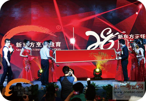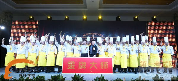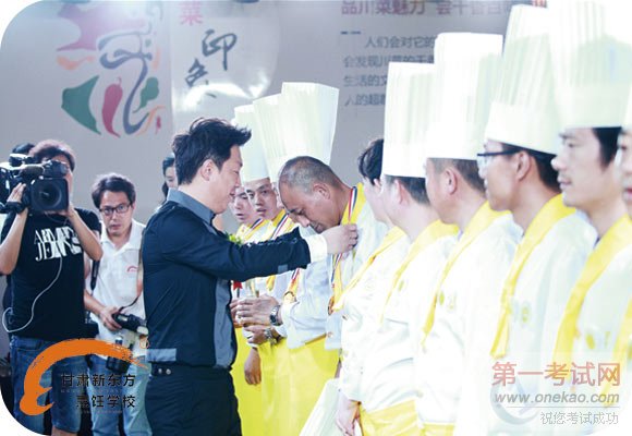 在新东方烹饪教育28周年庆典晚会中,为了这样一群“不简单”的人,设置了一个特殊的颁奖环节。由中国饭店协会副会长、新华教育集团常务副总裁许绍兵、新东方烹饪教育品牌形象大使黄渤亲自上台,揭开舞台上一块白板的红绸,用金勺,舀起金粉,缓缓撒上白板,接下来就是见证奇迹的时刻!白板上的字迹逐渐清晰,“金牌大师”四个大字显现出来。