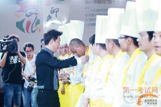 随后,28位新东方烹饪教育金牌大师一一上台,中国饭店协会副会长、新华教育集团常务副总裁许绍兵、新东方烹饪教育品牌形象大使黄渤为金牌大厨颁授奖牌与奖杯,并合影留念。