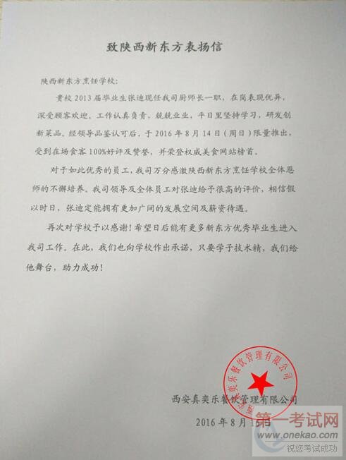 陕西新东方毕业厨师喜获用人单位表扬信