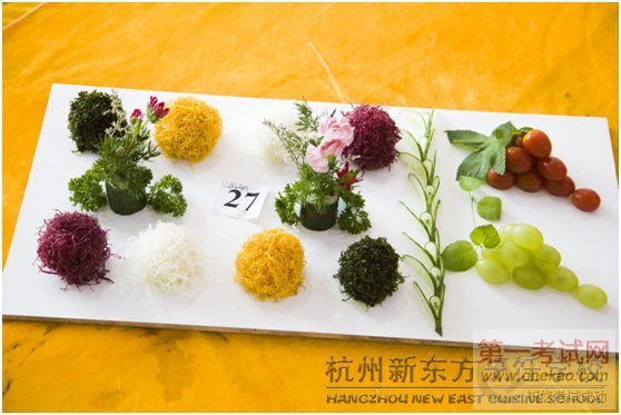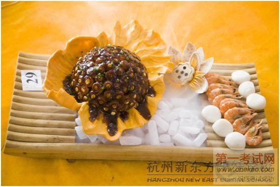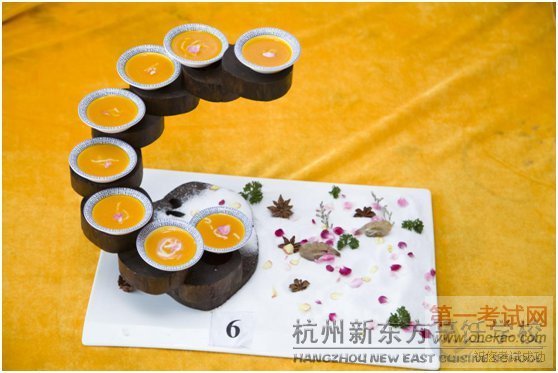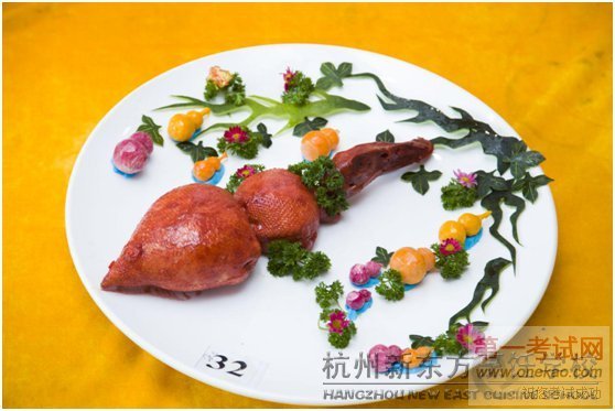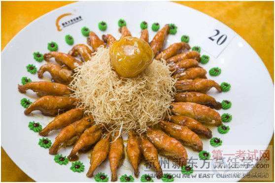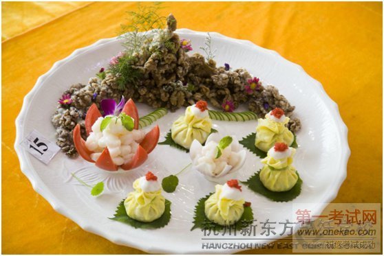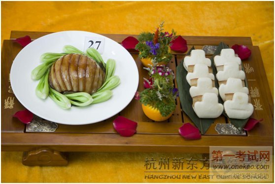 紧张的比赛,绚丽的菜肴。伴随着比赛时间的进行,各式菜肴渐渐拉开神秘的面纱,有寓意美好的“五谷丰登”、“丰收”,鲜艳夺目的“四彩虾球”、“八宝葫芦鸭”,别出心裁的“前程似锦”、,“莲蓬扣肉”,清新典雅的“龙井问茶”、“琵琶之韵”、“浓汤鱼花”,还有大气磅礴的“大鹏展翅”、“一品黄金虾”。一道道别开生面的菜肴展示的是新东方老师们扎实的烹饪技能基础,是他们对美食爱的提现。 #