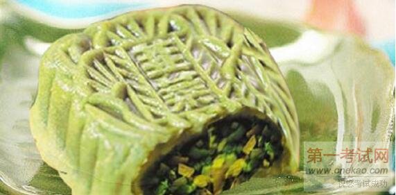 韭菜月饼可算是月饼界的网红,将新鲜韭菜切碎加入鸡蛋炒香,装盘晾凉备用。取出一小块揉好的月饼皮压扁,月饼皮包裹着晾凉的韭菜馅在模具压制成型之后放入烤箱,耐心等待几分钟,一个无论颜色、气味都别具一格的月饼便呈现在你面前。