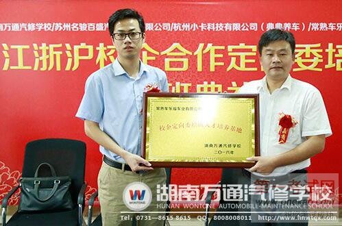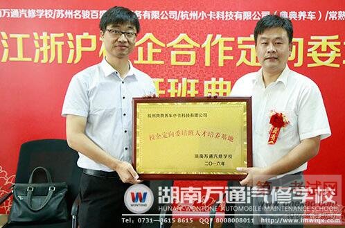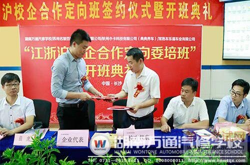 2016年8月27日上午,湖南万通汽修学校江浙沪校企合作定向班签约仪式暨开班典礼正式举行。出席嘉宾有苏州名骏百盛汽车服务有限公司人事主管苗虎、常熟车乐福车业有限公司人事经理茅凌宇、杭州小卡科技有限公司(典典养车)人事经理游洪光。湖南万通汽修学校校长潘太煌、校长助理韩明、教学管理部主任彭德荣、学生管理部主任续峰以及定向班全部学生也出席了此次盛会。
