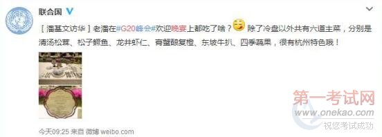 重点来了,贴心的习大大和彭妈妈为远道而来的各国政要们在杭州西子宾馆举行欢迎晚宴,用精致的杭帮菜招待各国领导人。精心准备的欢迎晚宴长什么样呢?先看看联合国微博。 #