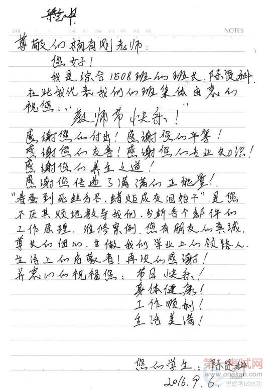 (综合1508班班长陈贤科写给杨有刚老师的信)