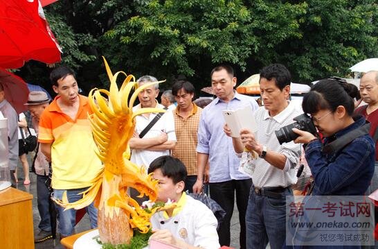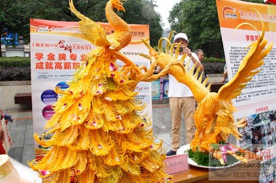 “哇,这老鹰和孔雀雕得太像了……”活动现场爆发出一阵阵赞美之声,原来是重庆新东方金牌大厨专业的学子在表演精湛的果蔬雕刻技术。看着那栩栩如生、巧夺天工的雕刻作品,大家争相拿出手机拍照留念。 #