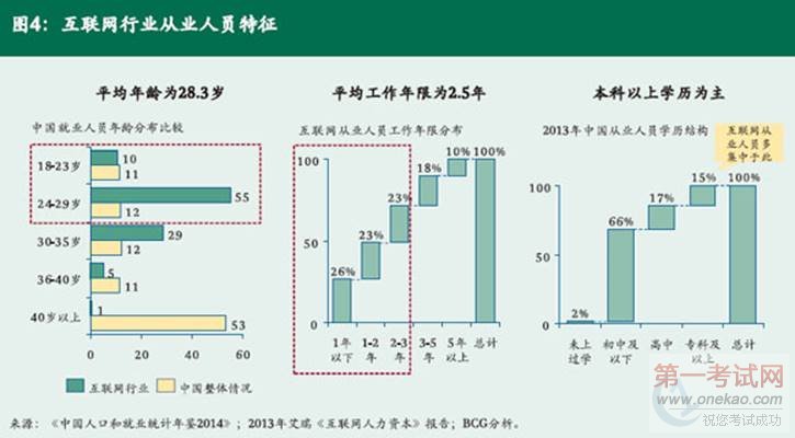 近年来,互联网行业呈现出年龄低、工龄短、学历高的特点。据统计数据,互联网行业从业人员平均年龄仅28.3岁,平均工作年限为2.5年,学历背景以本科为主。行业的快速发展给从业人员提供了更多就业机会,人才流动频繁,薪酬水平在人才争夺中也水涨船高。据统计,约有28%的从业人员会在任职1年内跳槽,而32%的人在2-3年内跳槽。此外,互联网从业人员平均薪酬水平明显高于社会平均水平,各企业为吸引留住人才,除了优厚工资以外还提供期权及股票奖励机制。在人才需求方面,由于任何创新模式落地都需要技术支持,技术型人才的到前所未有的重视。 #
