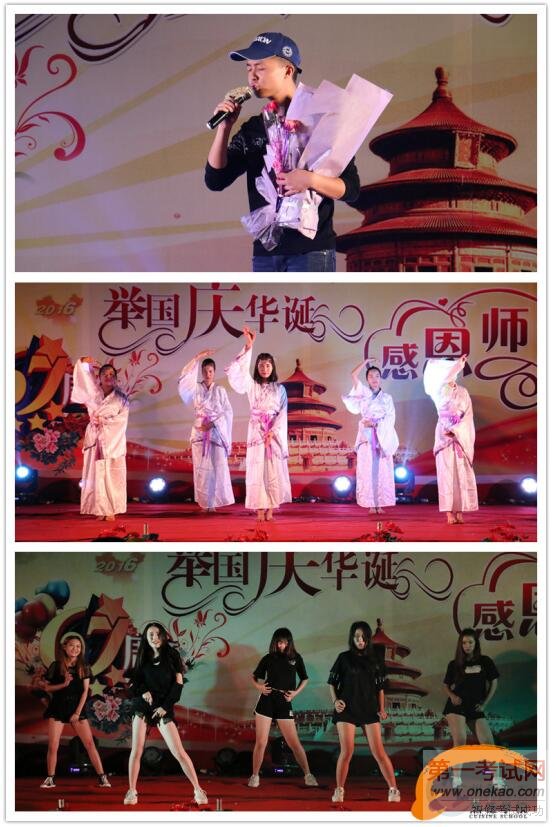 帅气的学生,充满激情的现代舞《得意门生》一亮相便吸引了全场观众的眼球,现场欢呼声接连不断。我校黄文顺助理为晚会开幕致辞:“在这秋高气爽的夜晚,我们欢聚广州新东方烹饪学校隆重举行2016年“举国庆华诞,感恩师生情”国庆晚会,共同庆祝中华人民共和国67周年华诞。在这美好的季节,我们迎来了2016级新生,在这里我代表全校师生向2016级新生同学们表示热烈的欢迎,并对在“裱花接力赛”和“叠军被大赛”中获奖的同学们表示衷心的祝贺!