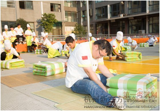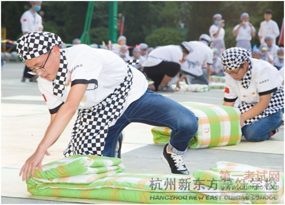 夏日的天气,骄阳似火,但场内场外同学们的热情却丝毫不减。20分钟的时间,只见选手们一个个将平铺的被子折叠、压实,动作流畅,技巧娴熟,普普通通的杭州新东方烹饪学校宿舍被子,在他们的手里像变魔术一样,变成了方方正正的“盒子”。