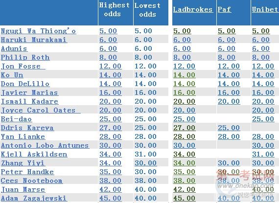 每年诺贝尔文学奖开奖前夕,全球几家知名博彩公司都会公布自己的赔率榜,今年村上春树毫无例外还是位居各大榜单的前排,屡次陪跑的他今年能否获奖成为人们津津乐道的一件事情。而中国三位作家同时入选赔率榜前20名尚属首次,最后的赔率榜显示,中国诗人北岛25/1的赔率排在第11位,阎连科28/1排在第13位,《丑陋地理志》《反红楼梦》作者张一一34/1排在第16位。 #
