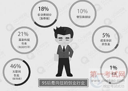 在国家“大众创业、万众创新”精神的提倡下,加之国内风生水起的互联网市场,一个个造富神话吸引着众多“95后”加入互联网创业的大军。报告显示,除求职就业(52%)、学习深造(21.43%)外,自主创业(15.31%)成为大学生就业新途径。将近一半的“95后”将创业目光紧紧锁定海淘、O2O、自媒体等新兴互联网创业项目,高薪科技创业项目也较受欢迎,并且越来越多的“95后”开始尝试农业创业,用自己学习到的先进知识反哺家。