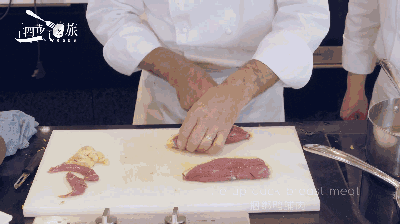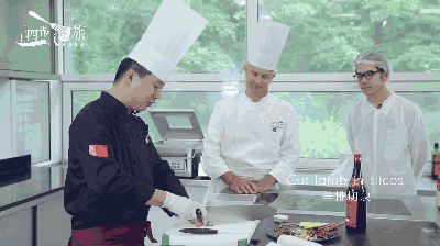 万事俱备,只欠……马老师闪亮登场咯!你看,换装上阵的马老师一如既往的自信从容,在耐心讲解的同时,手上也没闲着,切块、剔肉,谈笑风生间,羊排的第一道制作工序已经处理停当了。