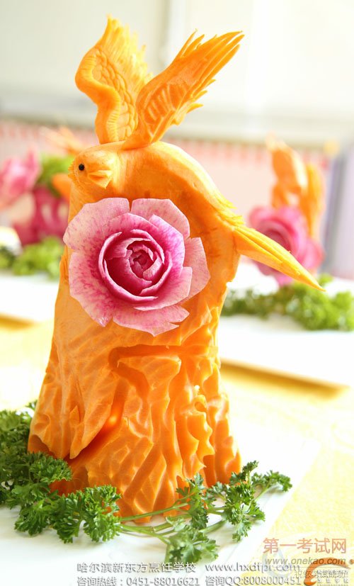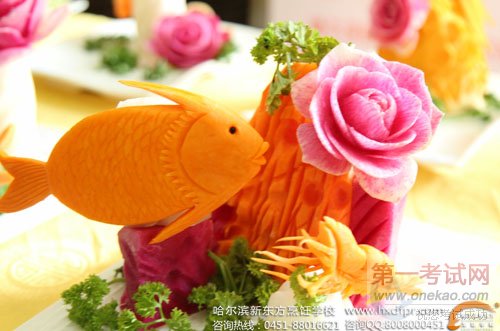哈尔滨新东方烹饪学校的全能十班班主任杨学刚老师说,中国的烹饪历史中在食品上加以雕刻的历史悠久,大约在春秋时已有。现代社会,食品雕刻是烹饪教育的一项重要组成部分,在哈尔滨新东方烹饪学校食品雕刻更是其中的必修课!