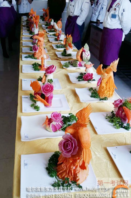 因为雕刻作品的不同,同学们在雕刻过程中还采用了不一样的方式组装自己的作品,比如全能十班的王同学的作品,因为作品比较大,像翅膀、尾羽、头等都要分开雕刻,然后进行组装才能完整的展示整部作品的形象,让人们更好的理解作品本身所包含的意境。在整个雕刻过程中,同学们或苦思冥想,或小心翼翼,或全神贯注,唯恐一个不小心就前功尽弃。经过他们的不懈努力,最终在规定的时间内完成了自己的雕刻作品,看着自己的作品,全能十班的李同学说,在来哈尔滨新东方烹饪学校之前从未想过自己也能雕刻出精妙绝伦的食品雕刻作品,现在看来,到这里学厨师是自己做出的最正确的选择! #