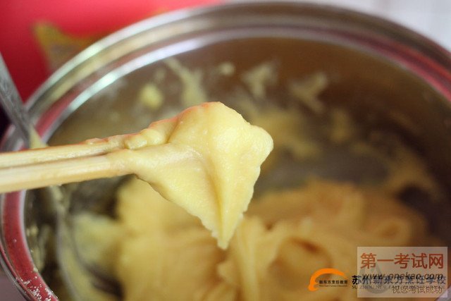 如果全部加完后面糊仍然非常稠厚,那么要适量再添加一小部分蛋液。最终的面糊要以标准的“倒三角”状态为准。太干的面糊会阻碍泡芙膨胀,造成体积不大、表皮较厚、内部空洞小;而太湿的面糊因为含水量过大,不容易烤干,从而导致成品扁塌、表皮不酥脆且容易塌陷。 #