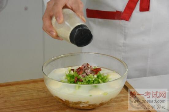 7:将切好的香葱花撒到鸡蛋上放上红干椒丁 #