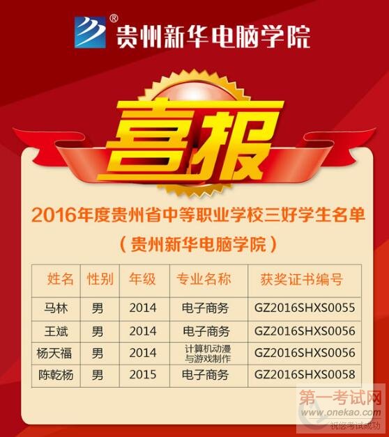 近日,2016年度贵州省中等职业学校三好学生表彰名单出炉。贵州新华电脑学院马林、王斌、杨天福、陈乾杨四名同学脱颖而出,入选三好学生表彰名单。