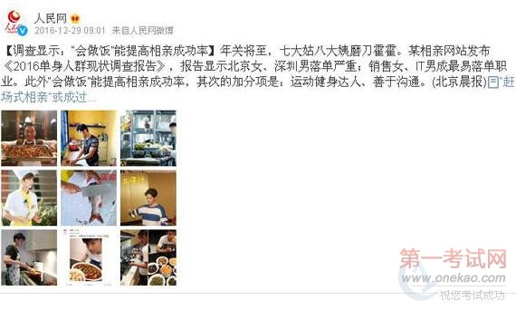 近日,某相亲网站发布《2016单身人群现状调查报告》,报告显示北京女、深圳男落单严重;销售女、IT男成最易落单职业。此外“会做饭”能提高相亲成功率,其次的加分项是:运动健身达人、善于沟通。