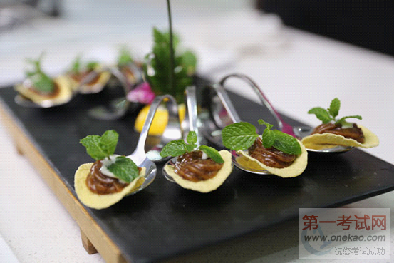 首先李大师制作的第一道菜肴是沙拉薯片枣泥,只见李大师把事先准备好的枣泥均匀的挤在薯片之上,点缀可口的沙拉,配以清凉的薄荷叶,精美的盘饰配上枣香的味道,就这样一道美味的菜肴就做好了。