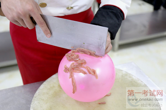 除了以上俩种刀工展示,还有惊险刺激的气球上切肉丝。这么高超的技法,小编看了也忍不住为小厨师们捏把汗,不过从我们小厨师们脸上看出他们显然胸有成竹,有条不紊地切完肉丝后,气球依然完好无损,看的我们不由得发出一声惊叹。这样娴熟的刀工,真的应该为他们狂点赞。