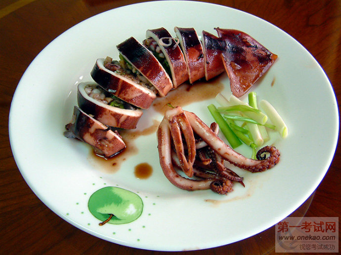 1.用酱油、糖、醋、辣油/葱油等你喜欢的调味料,兑成料汁,均匀淋在处理干净的鱿鱼内外,腌制5-10分钟。