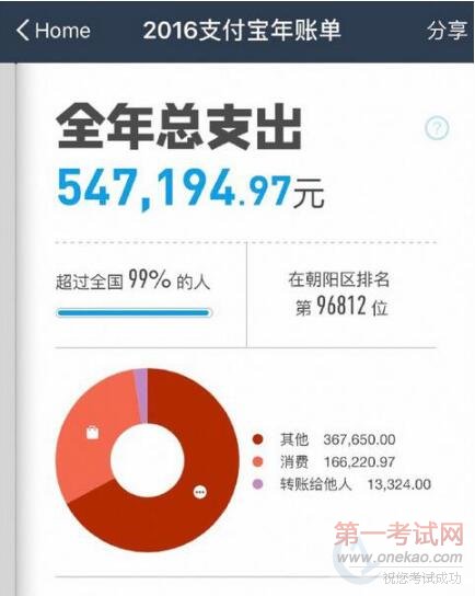 据支付宝统计,总支出53万,可以超过99%的人,总支出10万,可以超过90%的人。 #