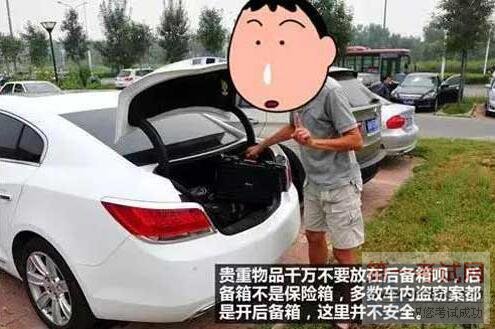 贵重物品不要放在车内显眼的位置,更不要放后备箱。虽然很多汽车都有防盗功能,但是然并卵,春节假期是盗窃高峰期,一定得防着点。
