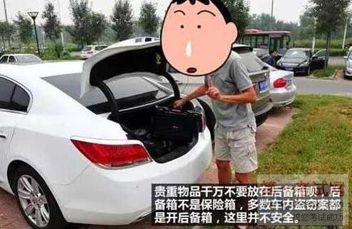 贵重物品不要放在车内显眼的位置,更不要放后备箱。虽然很多汽车都有防盗功能,但是然并卵,春节假期是盗窃高峰期,一定得防着点。
