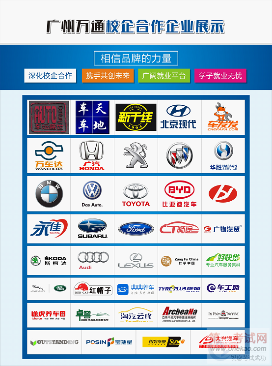 广州万通汽修学校与业内众多拥有高知名度的企业建立了长期校企合作关系,其中包括4S类、连锁美容快修类、维修厂类、互联网+类、改装科技类等上千家优质企业。