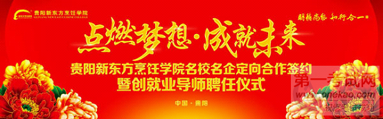 为进一步提高毕业生工作环境、薪资待遇,打造更高端的就业体系,贵阳新东方烹饪学院将与贵阳沁园餐饮管理有限公司、江苏扬子餐饮管理有限公司、北京为之味餐饮有限公司强强联手,开展名校名企定向合作,学生毕业后,就可进入该企业就业。签约仪式将于2017年2月22日上午10:30在贵阳新东方烹饪学院盛大开幕。 #