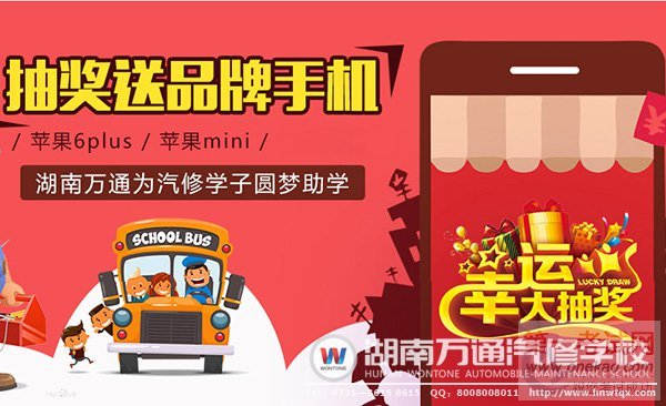 湖南万通汽修学校2017年春季心跳开学季!新生报名正火热进行中。学校被湖南省民政厅立为“大众创新,万众创业”定点机构,为激励有梦想的学生积极投身汽车事业、成就高品质人生梦想,现联合政府倾情助学,报名现场更有苹果手机、苹果平板电脑任性抽取。“鸡”不可失,约慧万通!
