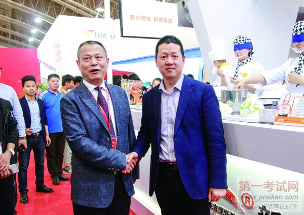 博览会现场,人力资源与社会保障部职业能力建设司司长张立新、新华职业教育社总干事王金宝等领导莅临参观了新东方烹饪教育职教成果展台,并与新华教育集团烹饪事业部总经理金晓峰亲切交谈。